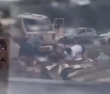 Imagens mostram pessoas recolhendo mercadorias após caminhão ficar danificado na rodovia