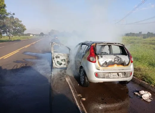 Um veículo foi destruído por um incêndio na manhã desta sexta-feira (25), na alça de acesso à rodovia Marechal Rondon.