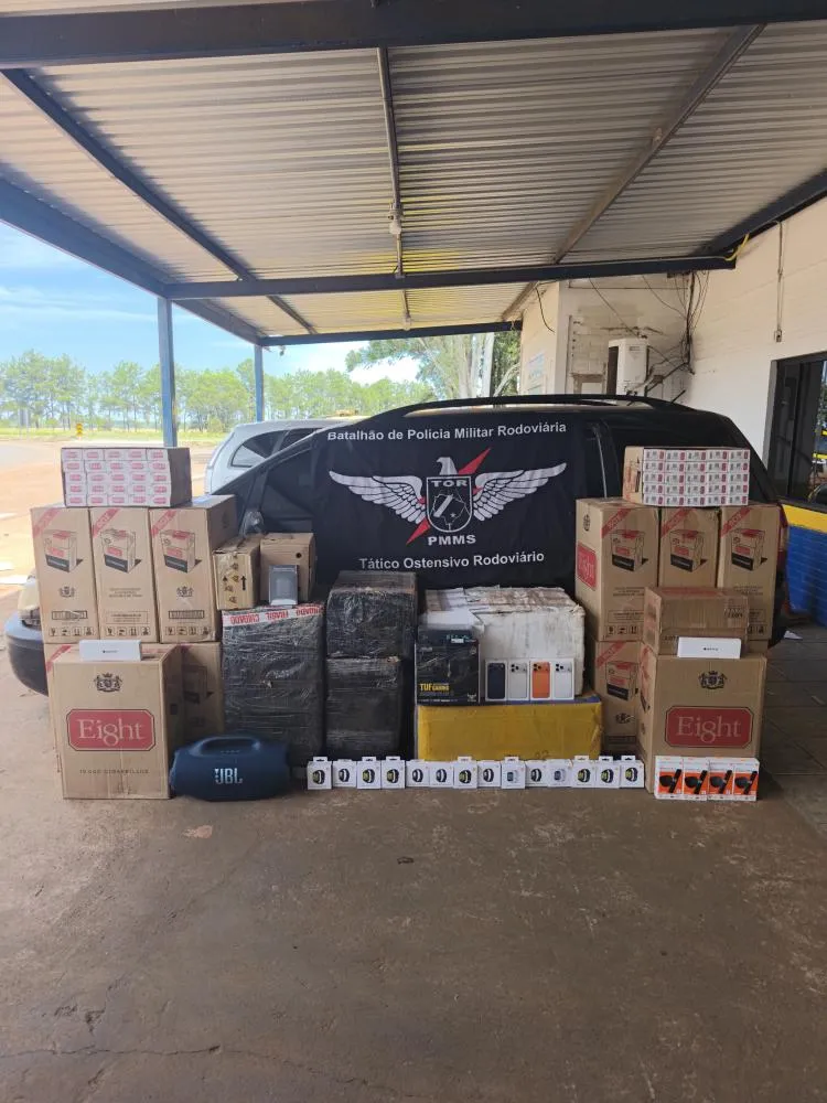 Durante a vistoria no veículo, os policiais encontraram diversos volumes contendo cigarros, cigarros eletrônicos, celulares, perfumes importados, equipamentos eletrônicos, relógios inteligentes e outros produtos de origem estrangeira.